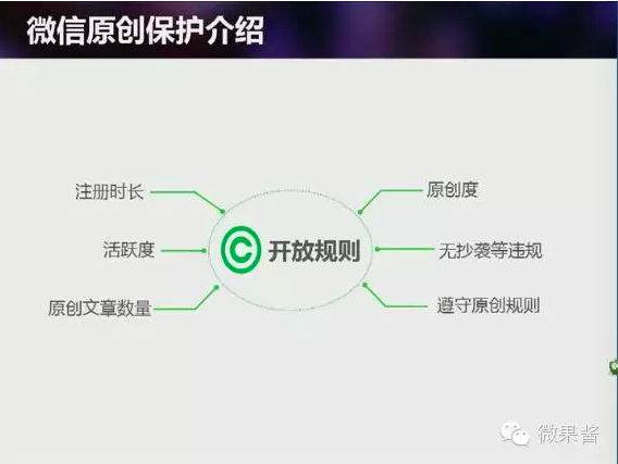 据悉,注册时长、活跃度、原创文章数量和原创程度等6项指标决定了能否开通原创保护。 微信官方现场透露, 一个能开通原创保护的帐号,具有以下特征: