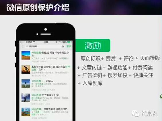 今年以来,微信团队陆续推出了原创标识、文章内链、评论、赞赏等一系列原创保护激励措施,得到众多业内人士认可。在今天的公开课上,微信团队首次公开表示,未来在原创保护上还将加入付费阅读、辟谣功能、广告倾斜、搜索加权、快捷关注和原创入库等诸多原创激励措施。