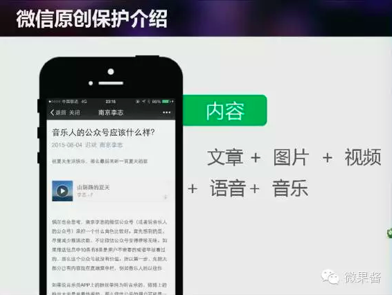 此外,在原创保护的内容上,除了文章外,一直颇具争议的图片和视频也被归纳其中,此外还有原创音乐以及语音。值得一提的是,微信语音功能今天将向所有公众号全面开放。