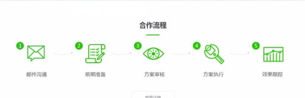 作为官网最重要的部分,微信团队详细地介绍了广告合作的5大流程。其中包括邮件申请、前期准备、方案审核、方案执行以及效果跟踪。五个步骤具体如下: