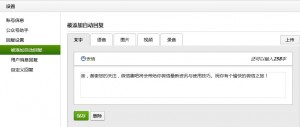 “自动回复”是用户第一次进入我们微信的对话框所呈现的欢迎语,“用户消息回复”是用户发送消息给我们微信后将得到的回复。D"T SHTf)?