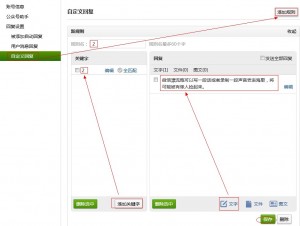 在自定义回复中我们就可以进行相应设置,在“自定义回复”中“添加规则”,随便填入规则名。在左侧“关键词”一栏选择“添加关键词”,并填入“2”。在回复一栏中选择我们要发送内容的格式并填入回复内容。保存即可。