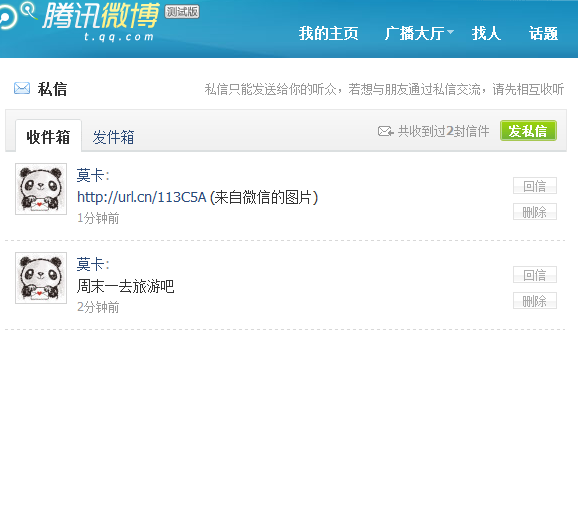 3、上图中,选择发送给"wowo"私信联系人,在"wowo"的微博私信中会看到"莫卡"发来的信息。