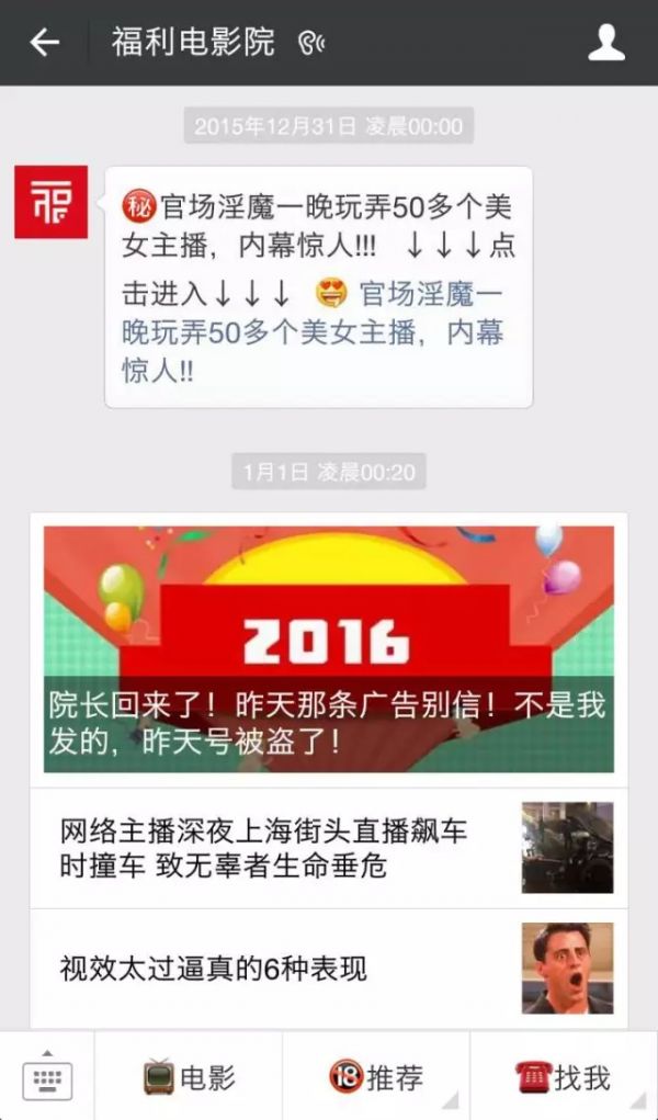 1月6日零点刚过,“新榜指数800交流群”有运营者爆料称,多个微信公众号几乎同时推送了同一则文字消息,涉及淫秽信息,疑似公众号集体被黑。