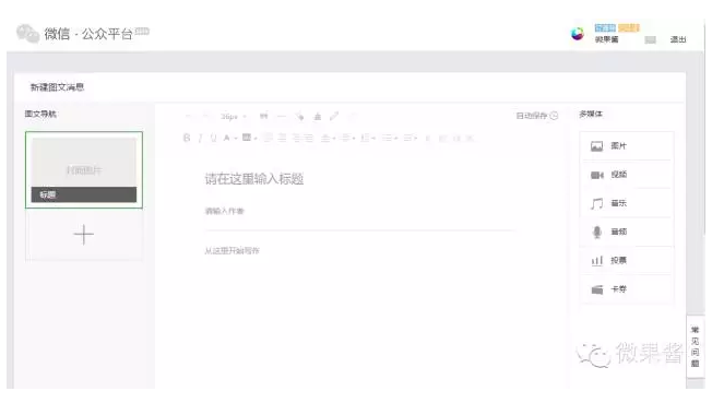 今天下午,微信公众号后台正式开启了新编辑器的内测。微果酱有幸获得此次内测资格,下面就带大家看看新编辑器有哪些变化。 u'k}%^us4o&WQ)c